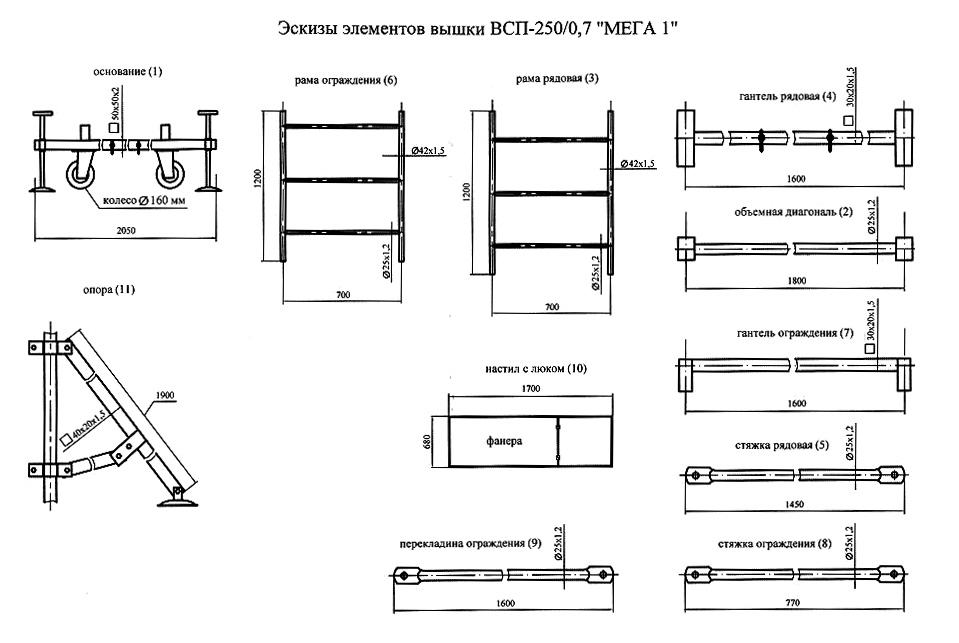 8.1. Обслуживание вышки заключается в осмотре деталей перед началом работы, в случае обнаружения деталей имеющих механические повреждения, пользоваться вышкой запрещается. В случае повреждения фанеры настила, заменить на новую, толщиной не менее 12 мм.