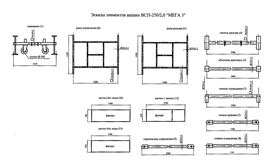 8. ТЕХНИЧЕСКОЕ ОБСЛУЖИВАНИЕ ВЫШКИ 8.1. Обслуживание вышки заключается в осмотре деталей перед началом работы, в случае обнаружения деталей имеющих механические повреждения, пользоваться вышкой запрещается. В случае повреждения фанеры настила, заменить на новую, толщиной не менее 12 мм.